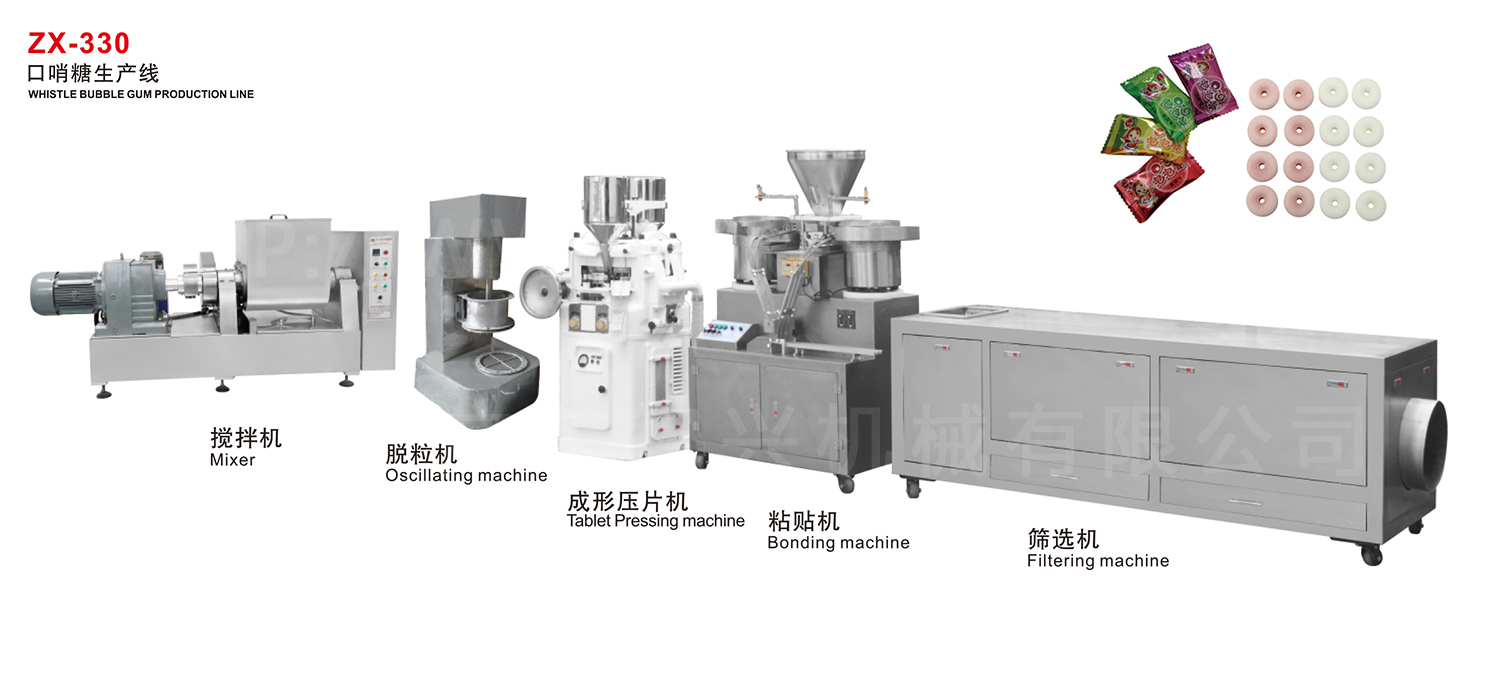 本套生產(chǎn)線由攪拌機(jī)、脫粒機(jī)、成形壓片機(jī)、粘貼機(jī)、篩選機(jī)組合而成,能夠生產(chǎn)出高質(zhì)量、獨(dú)特的口哨糖,深得大人小孩的喜愛(ài)。
